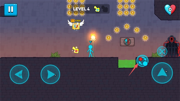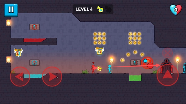 游戏整体的玩法较为简单,地图中会随机出现各类机关,玩家只需找出机关的规律,借助自己操控的火柴人实现通关即可。