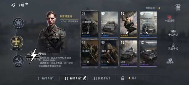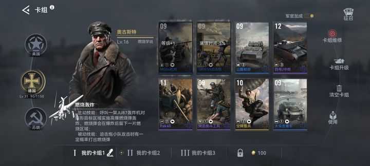 在 1V1 的强度方面,苏联>美国>德国 (即便在 2V2 中情况也大致如此)。因此,我建议新手玩家优先选择苏联和美国进行游玩。不过在玩之前,需要先抽卡,获取那些核心卡牌,这样更容易上手。关于核心卡的具体情况,下面会详细说明。