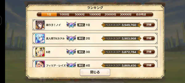 竞技场分为两类:普通场(设有排行榜)与 EX 场(无排行榜)。每场每日均能参与 3 次,两场共计 6 次,参与可获取竞技场币与累计分数奖励,登上排行榜还能得到额外奖励。(特别提醒,请勿使用,我接触过不少榜一玩家,在排行榜结算后便再未上线,推测已被封号。) 至于竞技场的配队,可访问(https://gamewith.jp/konosubafd/)查看队伍推荐,该链接是素晴wiki,展示日服进度。日服排行榜前十中有一位是哔哩哔哩的 up 主,其队伍配置值得参考,UID 为:567912455 。此外,也能查看排行榜 1 - 30000 名玩家的配置。