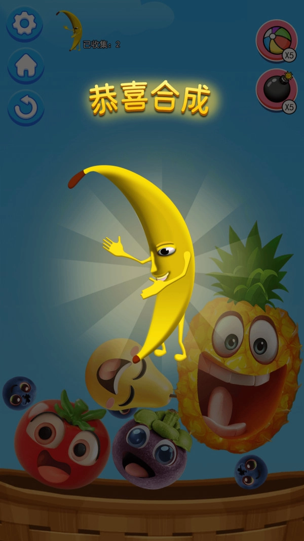 当把多份基础品类的果实合成为更高级的品种时,其周边的低等级果实会自行迸裂消失,进而触发一系列连续的消除现象。