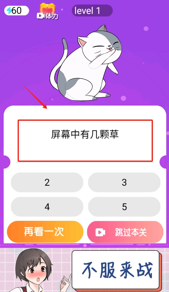数一下屏幕里的草有多少根,选对答案就能通关,要是没看清楚可以点击“再看一次”。