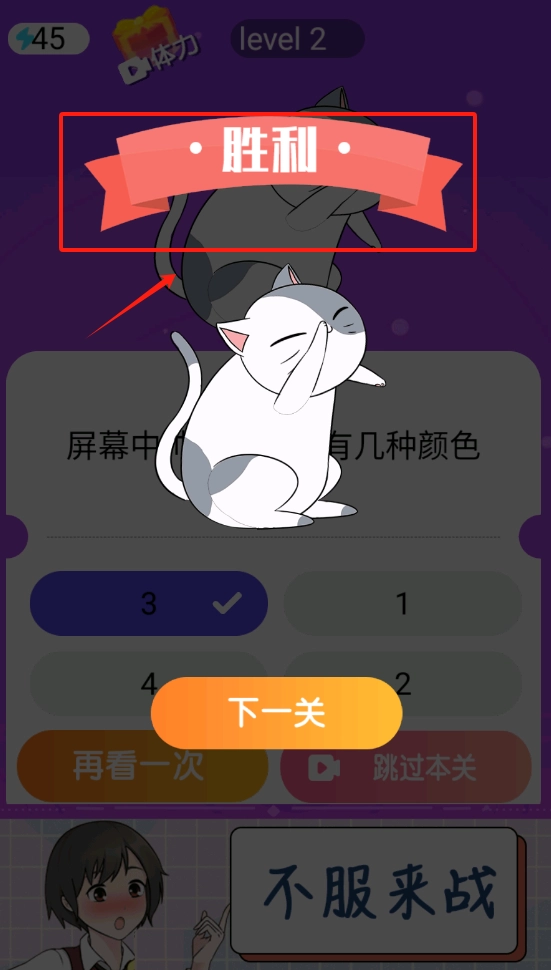 识别画面里的几种颜色,选对数量即可通过关卡,要是选错了还能重新观看一次。