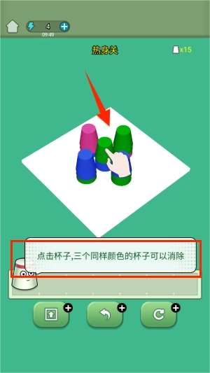 点击杯子,三个颜色一样的杯子就可以消除了。