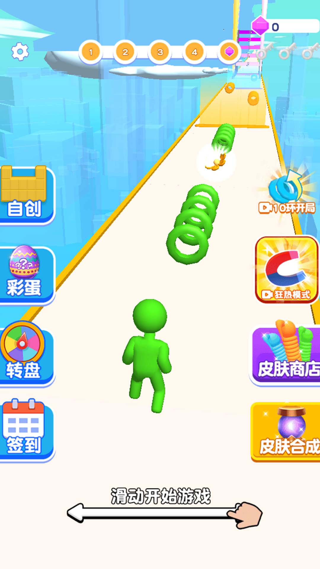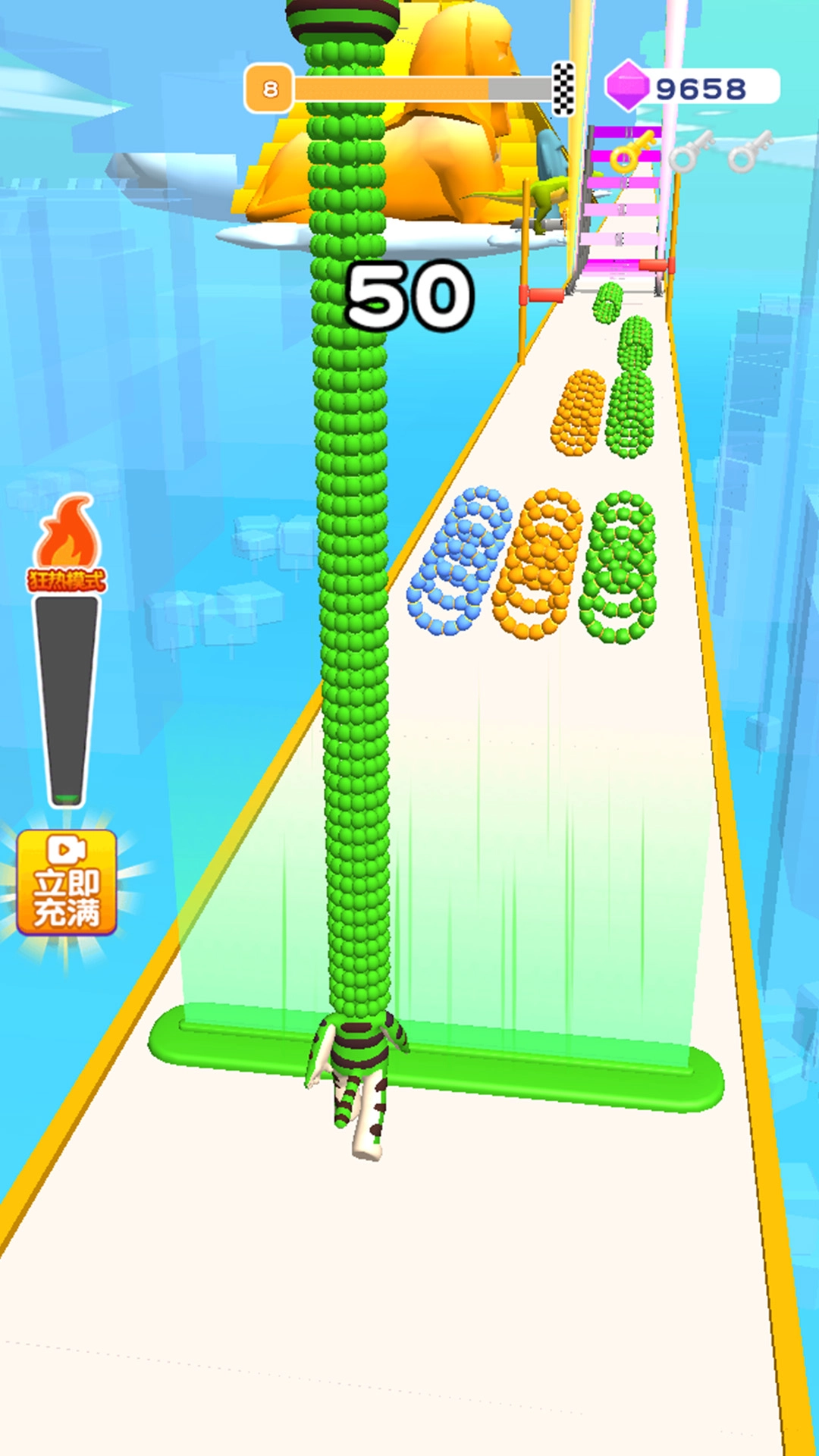 在跑道上收集对应颜色的圆环能让脖子变长,不过要注意避开其他颜色的障碍物,一旦撞上脖子就会缩短。