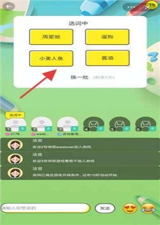 进入游戏后,玩家会进入选词环节,此时界面会显示诸如“周星驰遛狗”之类的词语选项,玩家可从中挑选绘画题目;若对当前选项不满意,还能点击“换一批”来获取新的词语。