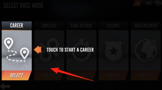 在模式选择的界面中,找到带有箭头标识的“TOUCHTOSTARTACAREER”选项并点击,即可进入生涯模式。