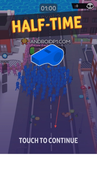 游戏里出现HALF-TIME提示就进入中场休息,按屏幕上的TOUCH TO CONTINUE提示就能继续游戏,要凭借人数上的优势击败其他队伍。