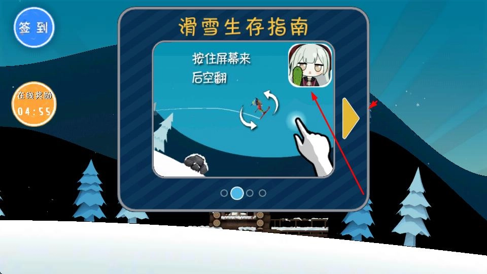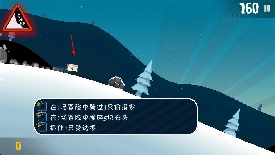 在滑雪冒险的过程中,试着去完成一些任务,像在一次冒险里滑过3只偷摸零、撞破5块石头,为了得到奖励而努力。