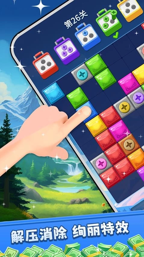 超多关卡等你来玩!每个关卡都有不同的要求,你得好好操作才能完成任务。只要分数够了就能过关拿奖励,一点都不难,放心玩!连消特效的把控堪称完美,每一次连消都能带来不一样的分数加成,最终加成效果由方块数量决定,整个过程十分精彩有趣。 连消特效的呈现恰到好处,每次连消都会有不同的分数加成,最终加成效果取决于方块数量,玩起来精彩又有趣。