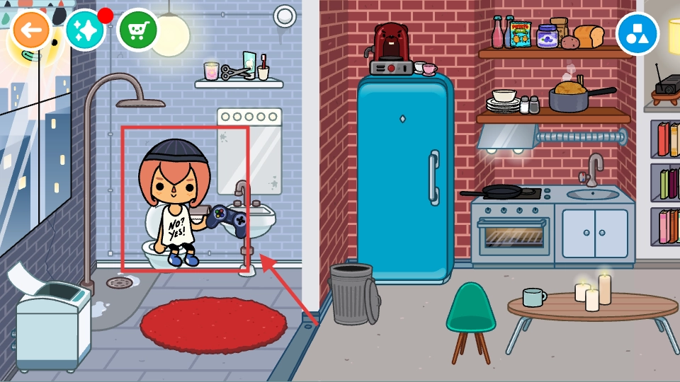 可以把红头发的角色移到有马桶和洗手池的卫生间里,他还是能拿着游戏手柄接着玩游戏。