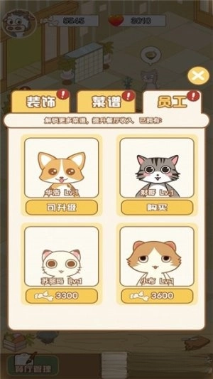 员工管理方面,餐厅能够招募厨师、服务员和猫咪店员,并通过合理安排他们的岗位,来提升餐厅的运营效率。