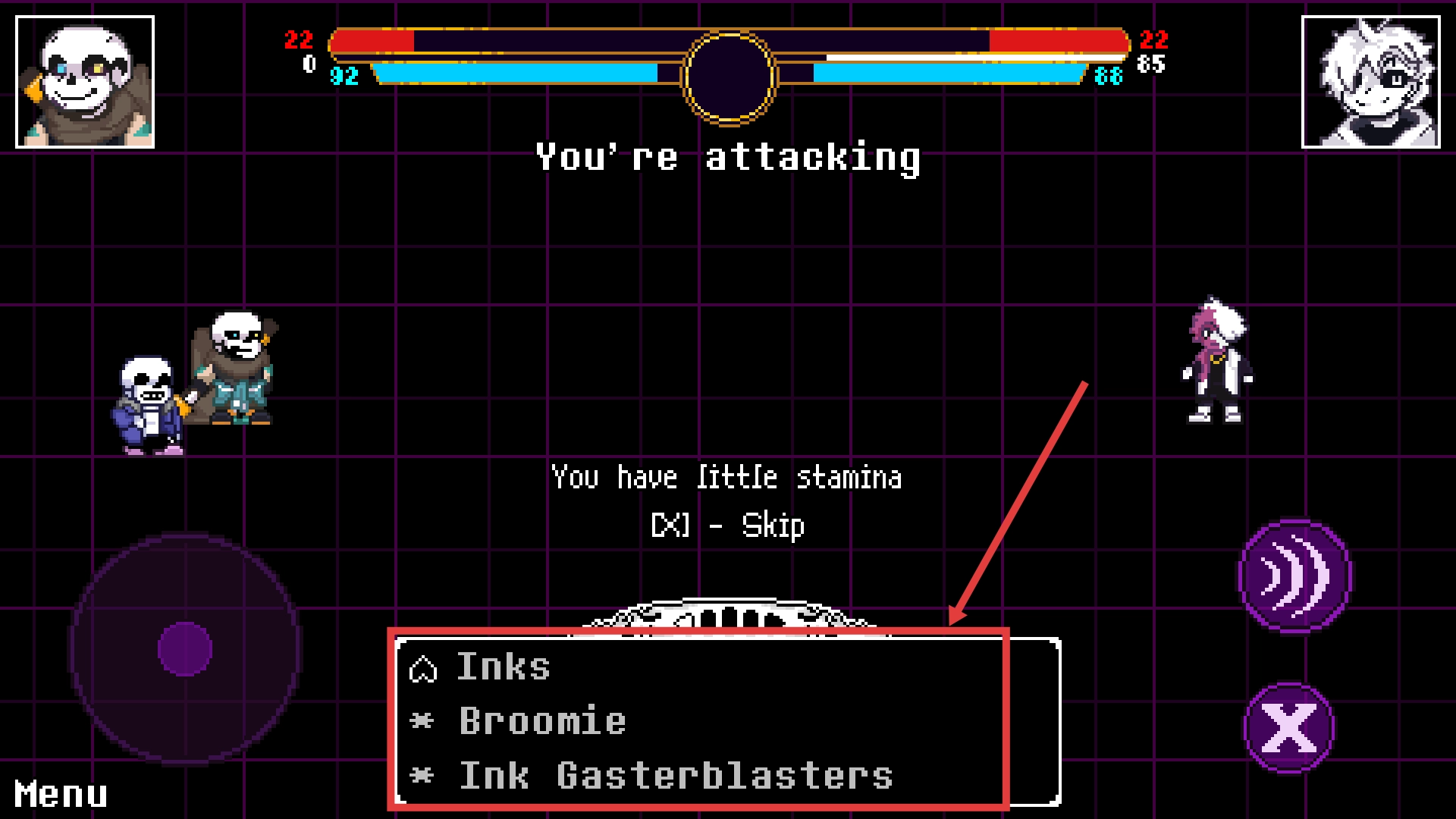 在发起攻击时,能够选择【Inks】-【Broomie】-【InkGasterblasters】这类技能,通过对技能进行合理的组合搭配,可以提高战斗的效率。