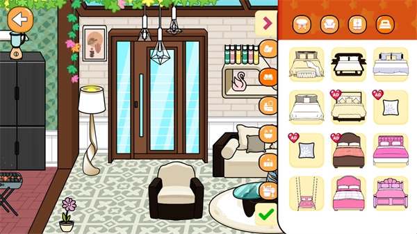 进入房间后,点击右上角的按钮就能进入装饰界面,在这个界面里你可以随意更换各式各样的家具物品。