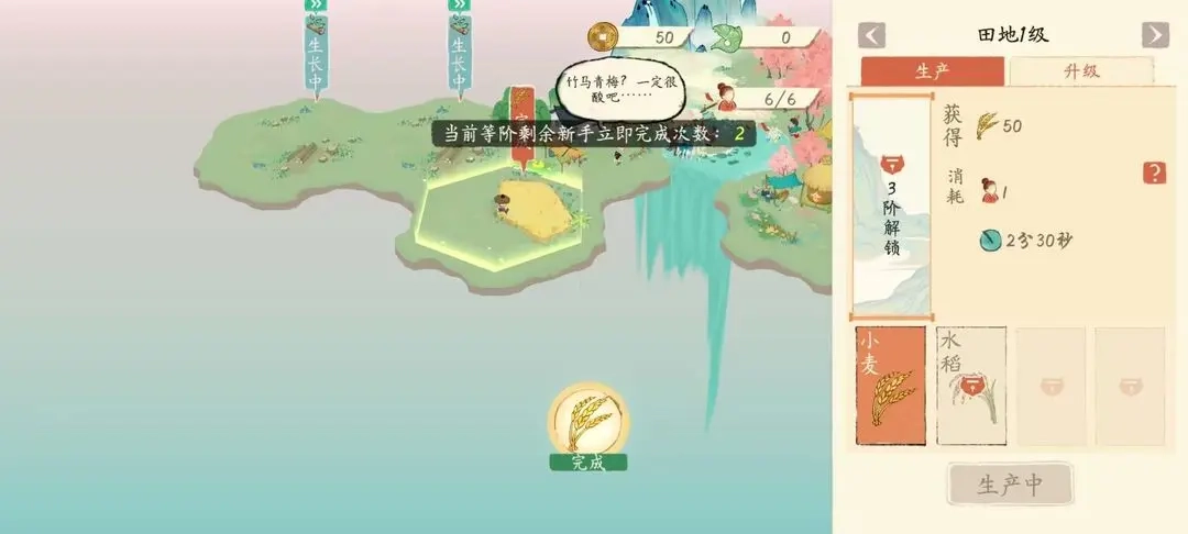 棉花等你升到6阶,哪怕再紧缺也只需要留一块田来种它,另外两块田就种水稻和小麦。不然到后面养殖场和食堂的运作都会受影响,容易出现资源卡壳的情况,所以资源分配一定要均衡!