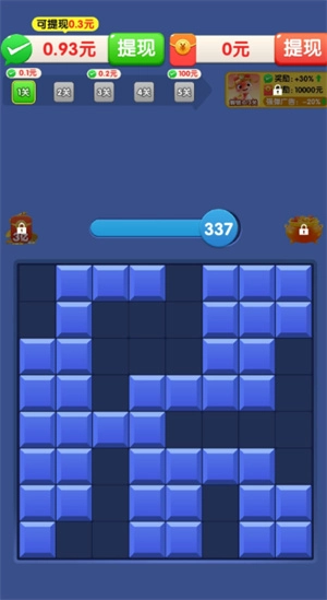 这是一款名为“多福多贵”的消除类闯关小游戏,核心玩法是通过挪动方块,让横竖排都铺满方块,即可完成消除并获得相应分数。当分数累积到目标数值就能顺利过关,并且可以领取过关红包,这些红包都能轻松到账。游戏前期关卡难度较低,玩家很容易就能通过。