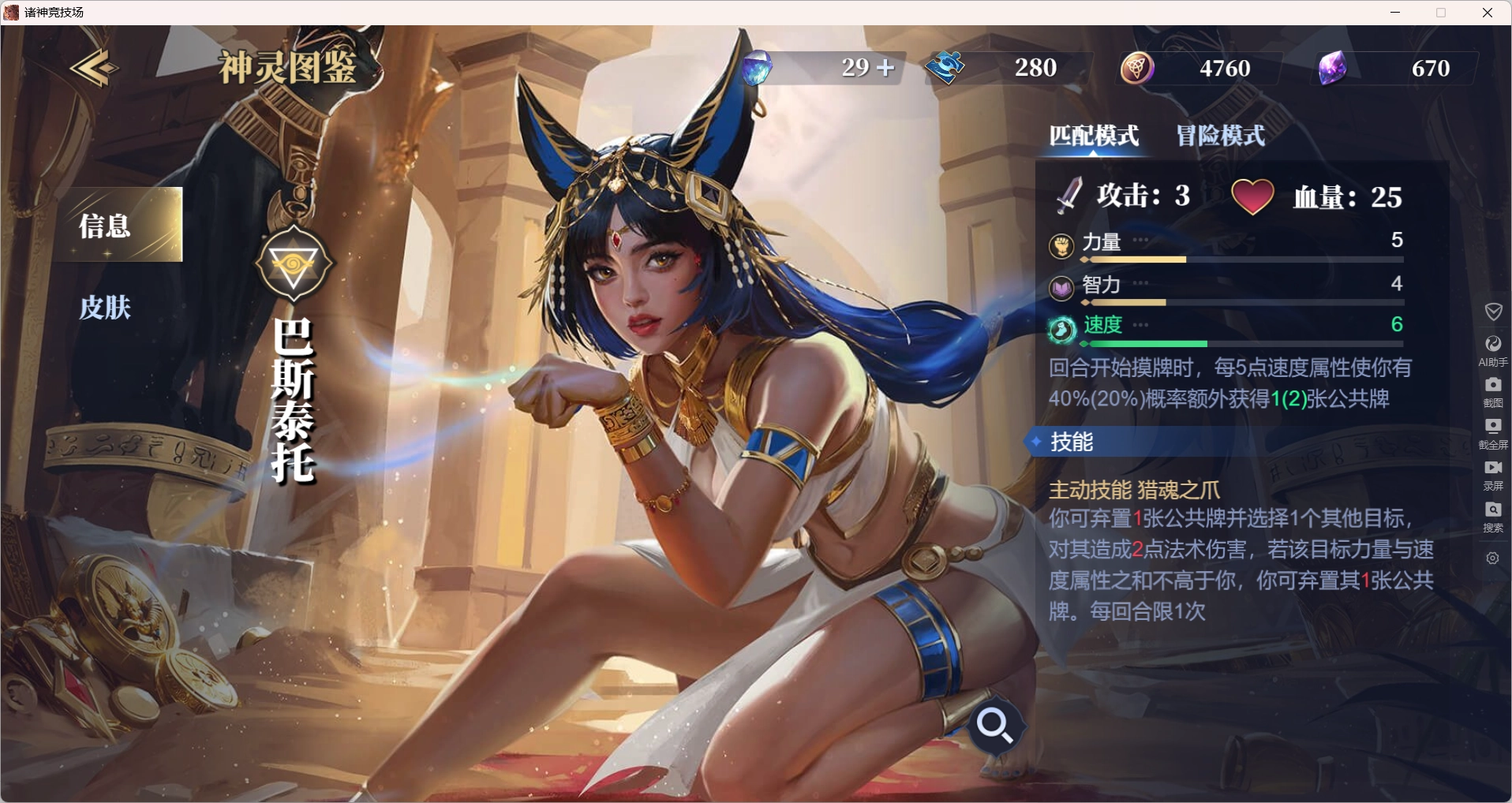 当前版本的技能卡配置里,“灵魂汲取”“诡计多端”“三重神力”这三张基本是必选的。选用“潜影蛇手”,主要是它的效果足够强势,对属性的要求也不算高。选择“火眼金睛”则有两点考量:一来通过这个技能本身就能实现窃取,对“潜影蛇手”的依赖度较低;二来作为专属法术,“火眼金睛”保底能提供4点法伤,效果强劲且没有属性门槛。至于携带“神力削弱”,是由于其技能具备特殊效果,这一点前文已经提到过,这里就不再重复说明了。