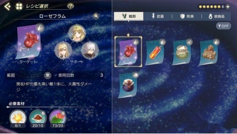 获取配方后,挑选共同进行调和的角色与素材,巧妙运用角色的「天赋颜色」及其特性来制作道具。