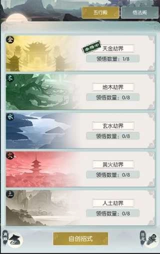 在这个界面上,能看到金、木、水、火、土五种属性的图谱,若想自创招式,第一步便是先领悟这些图谱。