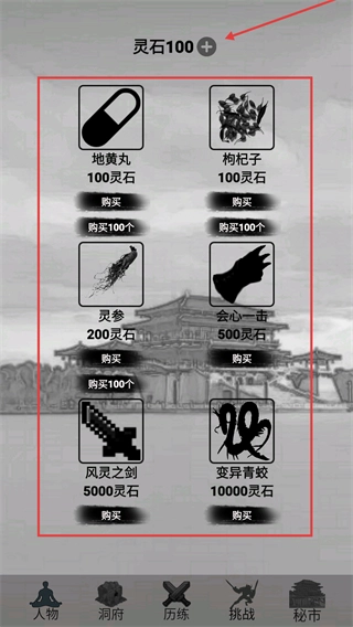 在秘市界面,你可以用【灵石】购买【地黄丸】、【枸杞子】这类物品,建议优先挑选性价比高的资源,以此来积累战力基础。