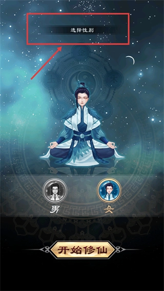 进入游戏后,请先完成“选择性别”的设置,在“男”和“女”两个选项中选择其一,然后点击“开始修仙”按钮,就能开启你的修仙之旅了。
