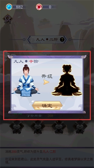 突破成功后会弹出【凡人】-【二阶】的升级提示框,点击【确定】按钮即可完成境界提升流程。