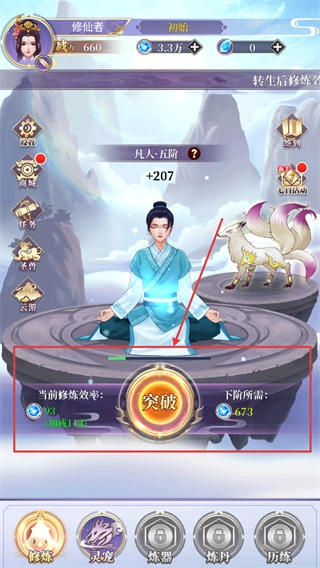 当处于【凡人-五阶】阶段时,点击【突破】按钮可提升修炼效率,通过积累足够资源以满足下一阶段的需求,从而推进自身成长。