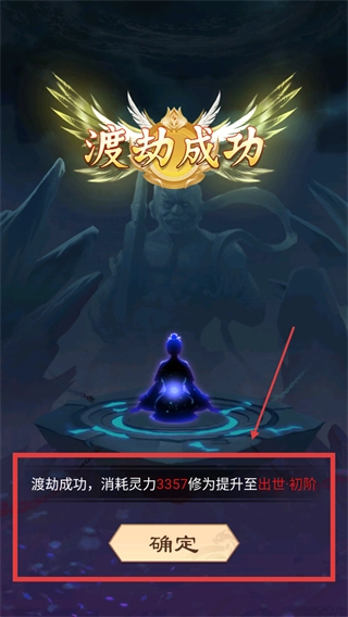 渡劫成功后,消耗【3357】灵力,修为提升至【出世-初阶】,点击确定继续后续修炼进程。