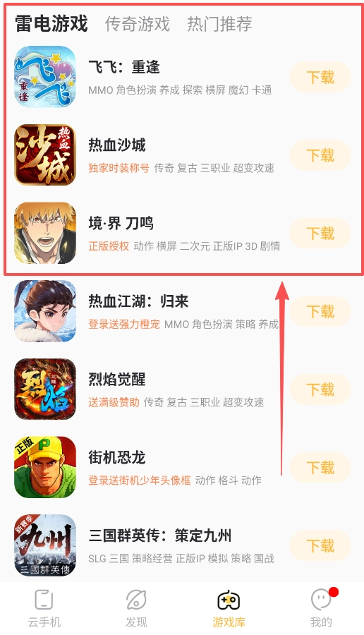 在“游戏库”里,你能够批量选择热血沙城、境界刀鸣这类想要的游戏,之后这些游戏就会在云手机中自动完成安装。