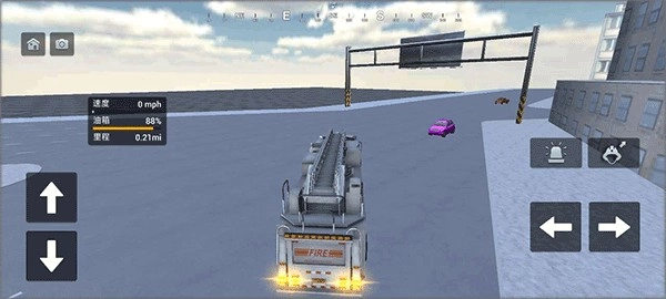 我们驾驶消防车奔赴火灾现场,右侧的箭头按键用于控制车辆前进与后退,右侧的方向键则负责调整车辆的行驶方向,右侧上方的图标功能分别是开启车辆报警器和切换消防水管。