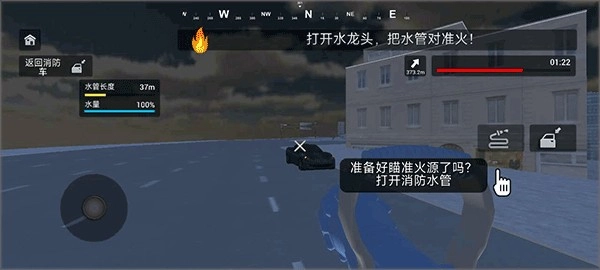 点击图中所示位置,即可调出消防水管,对准火源实施灭火。