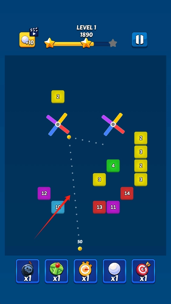 2、当弹球处于飞行状态时,留意它的运动轨迹,尽可能促使弹球碰撞到更多的数字方块,通过消除这些方块来得到分数。