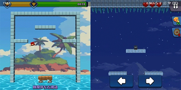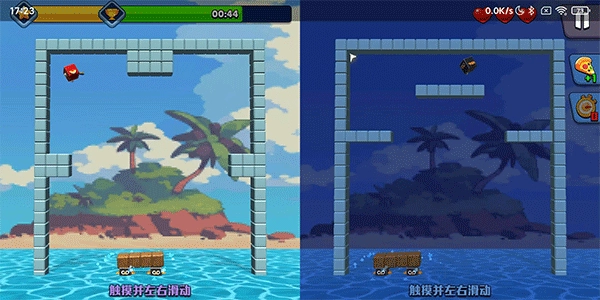 3、游戏设有两个需同步操作的区域,你的任务是触摸并左右滑动下方的浮板,接住又又鸟和牙牙鸭,避免它们掉入水中。