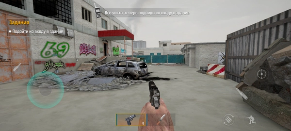 2、左侧轮盘用于操控人物移动,右侧则分布着攻击、换弹、下蹲等功能键位。