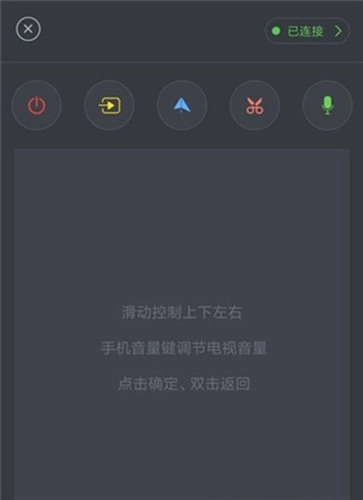 3、等连接成功后,会弹出一个遥控器界面,通过滑动操作来控制电视的上下左右方向,手机的音量键可以用来调节电视音量,点击对应区域实现“确定”功能,双击则能返回上一级;界面上方设有几个功能按钮,分别对应电源、投屏、镜像、截屏和语音控制,输入指定的语音指令即可操控播放。