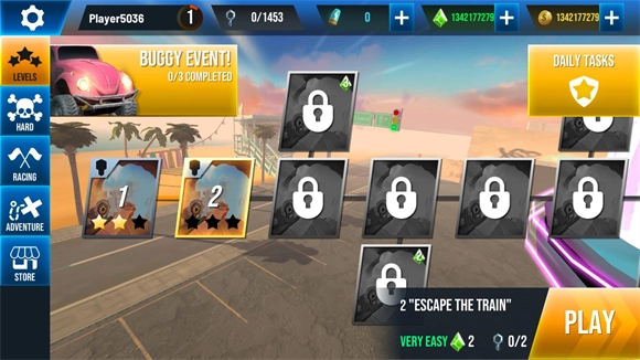 3、点击play后可选择用于闯关的车辆,点击左右箭头能够切换车辆,未解锁的车辆可点击buy按钮消耗绿宝石进行解锁。