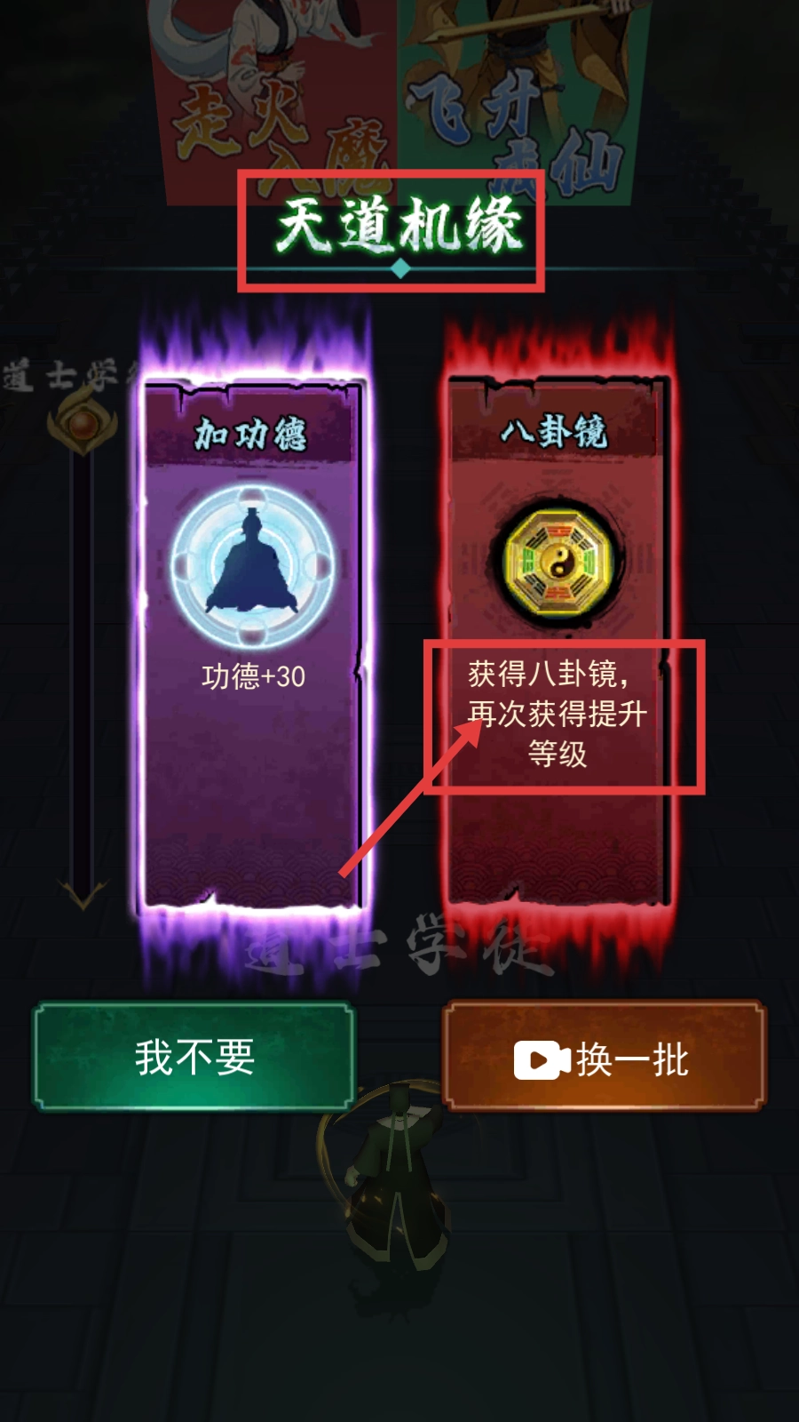 2、当出现【天道机缘】的选择界面时,建议优先挑选【八卦镜】,它能够帮助提升等级、增强战斗能力,从而更好地辅助降妖任务的完成。