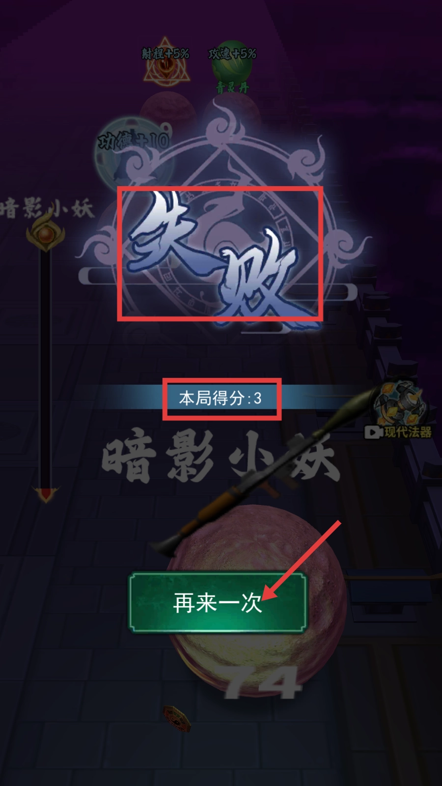 4、若界面显示【失败】,当本局得分为3时,可点击【再来一次】重新挑战,通过积累经验提升战力,以争取更高得分。