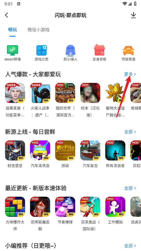 2、进入后滑动选择想要畅玩的游戏,像人气爆款这类,点击右侧的“更多”按钮进入。
