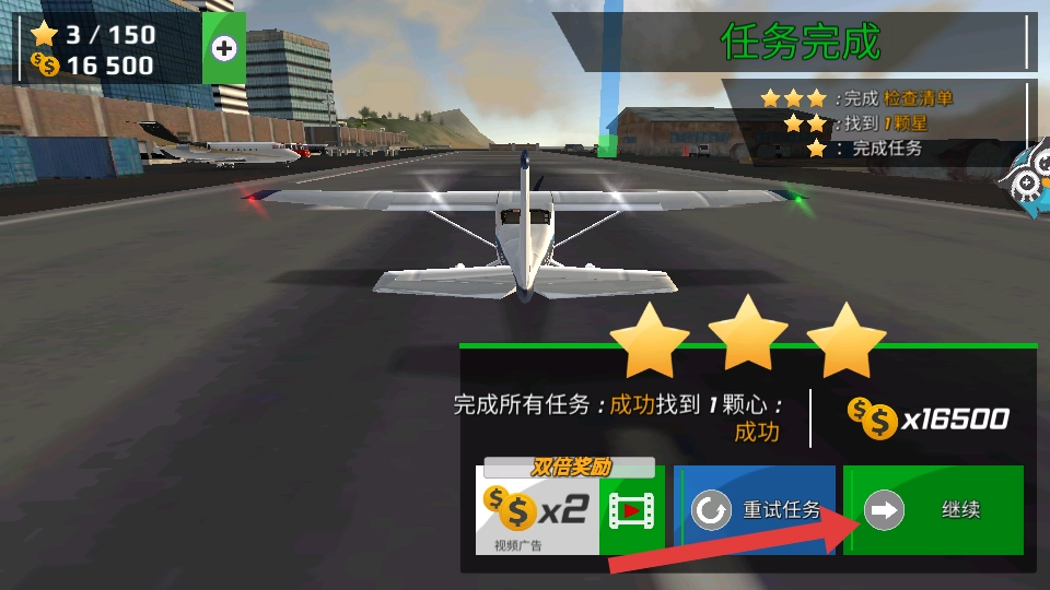完成任务后,你可以获得金币与星星作为奖励,点击【继续】按钮就能挑战接下来的任务。