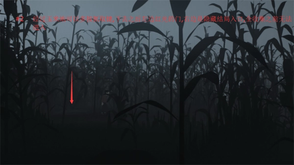 下去之后,左边是那扇发红光的门,右边则是隐藏结局的入口,在完成全收集之前,这个入口是无法进入的。