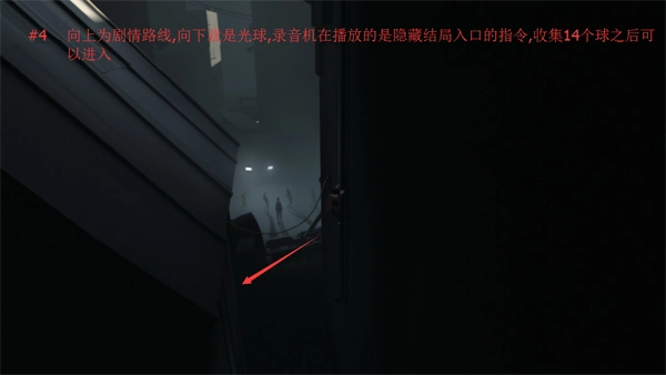 4、以上所述为剧情的推进路线,向上行进即可看到光球,而录音机正在播放的内容,正是通往隐藏结局入口的指令。当收集齐14个球之后,就能进入隐藏结局了。