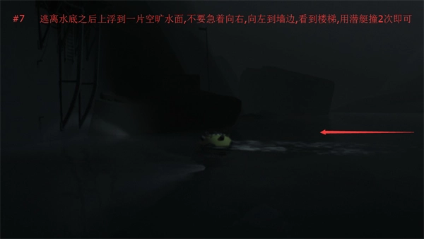 7、从水底逃脱后上浮到一片空旷的水面,先别急着往右边去,向左游到墙边,会看到楼梯,操控潜艇撞击几次就能打开通道了