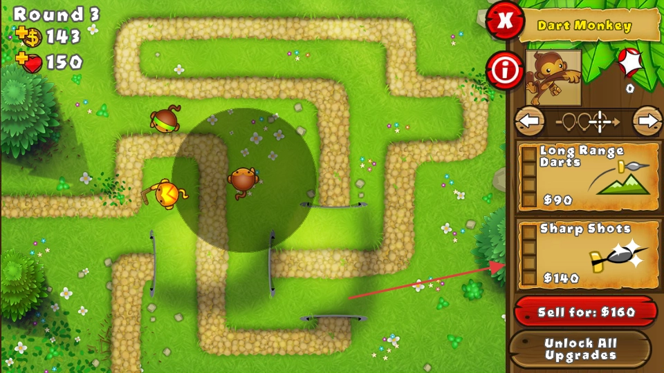 1、升级【DartMonkey】到【SharpShots】,每次射击可多爆一个气球,能有效增强前期对气球的防御能力。
