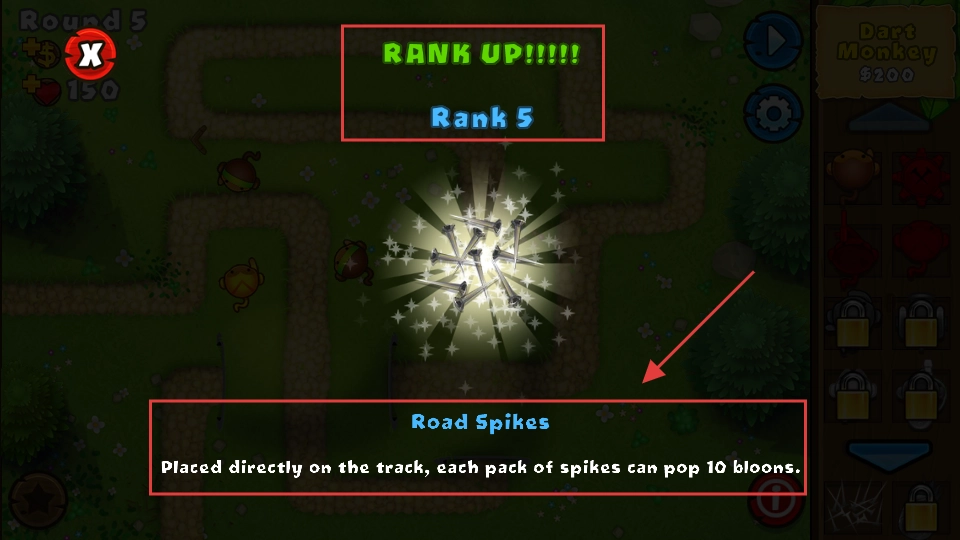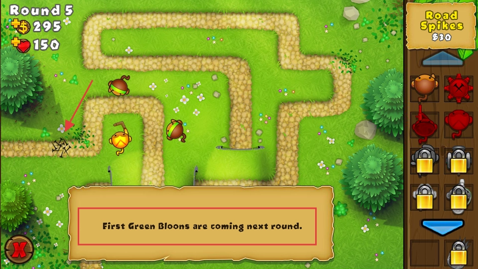 4、提前放置【RoadSpikes】在气球路径上,应对即将到来的【FirstGreenBloons】,增强路径的防御能力。