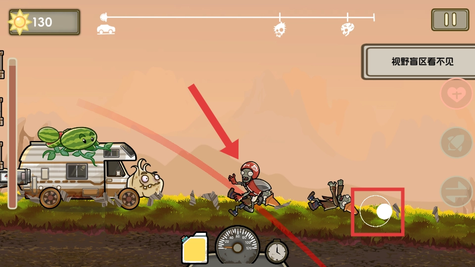 当遭遇僵尸时,点击攻击区域,即可操控战车上的植物武器对僵尸发起攻击,直至将它们全部消灭。