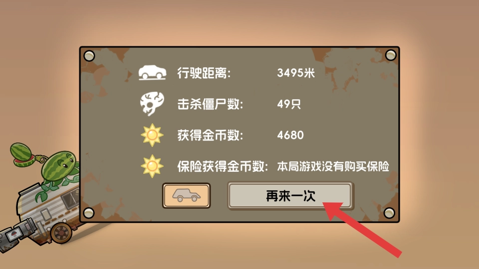 游戏结束后,你可以查看行驶距离、击杀僵尸数量、获得金币数量等数据,点击【再来一次】按钮,就能继续挑战,刷新自己的成绩。