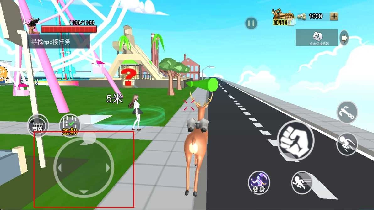 进入游戏后,通过操控左侧的虚拟摇杆,能够控制鹿在城市道路、草坪等不同区域移动,从而自由探索城市环境并接取任务。