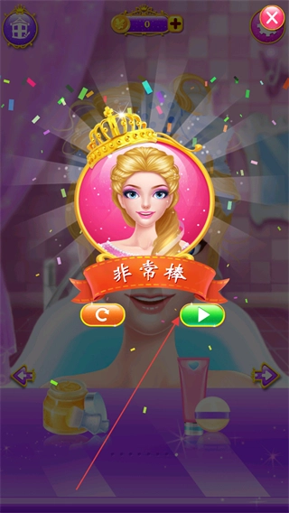 完成一系列美妆护理后,公主的形象变得焕然一新,收获了十分不错的评价,现在可以选择继续挑战,或是进入下一个美妆环节。