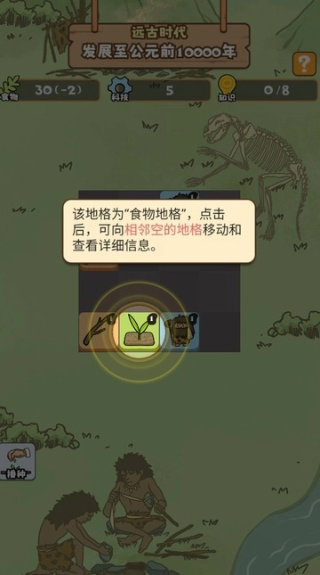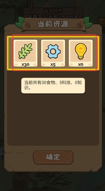 游戏开始时会显示玩家当前拥有的资源,一旦食物耗尽游戏便宣告结束;科技需要消耗资源来解锁或使用,当知识满足特定要求时,文明将进入下一个时代并得到相应奖励。