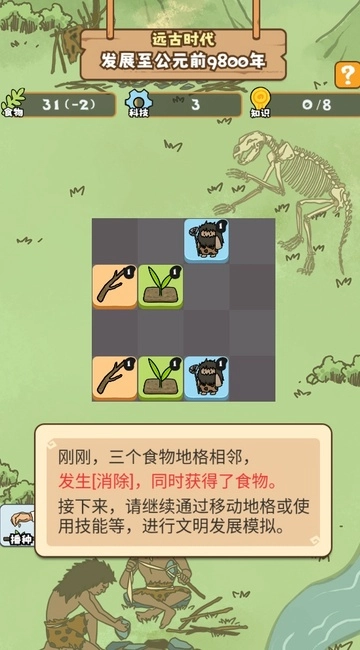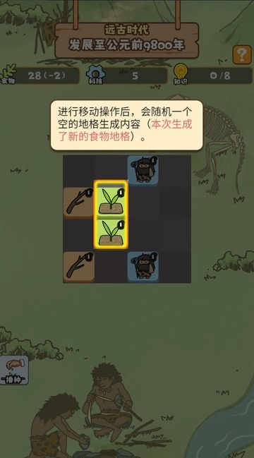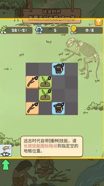左下角是我们的技能区域,远古时代开局时会自带一个播种技能。当使用技能或者移动地格,使得相同地格的相邻数量达到3个时,就能获取资源并消除这2个相同的地格。